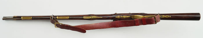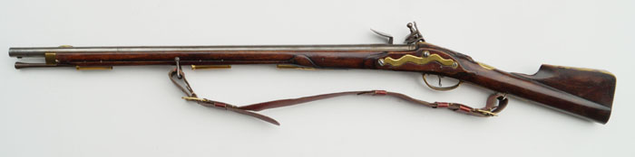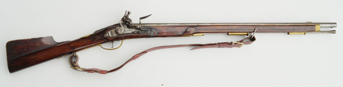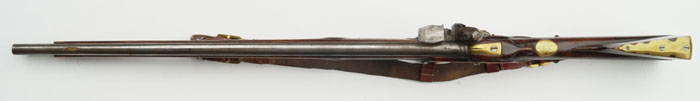 Dunkler Nussbaumschaft mit Kuhfuß und Messingbeschlägen, diese bestehend aus halbem Mündungsband, drei kantigen, aufgetrichterten Ladestockröhrchen, Abzugsbügel mit vorderer und hinterer Verlängerung, Kolbenblech mit langer, dreifach verschraubter Kolbenblechnase, flachem, schlangenförmigem Schlossgegenblech für drei Schrauben und ovalem Daumenblech mit Herrscherchiffre. Preußisches Steinschloss M1740. Flaches Schlossblech mit abgeschrägten Kanten und ebensolchem Schwanenhalshahn, eiserner Pfanne und oben gerade abgeschnittener Schlagfläche der Batterie. Die Batteriefeder von der Schlossinnenseite her verschraubt. Runder, am Pulversack doppelt kannelierter Lauf mit gerade endendem und vergoldetem Schwanzschraubenblatt. Abzug mit Abzugsblech aus Eisen, der Abzug stark nach hinten eingerollt. Schwanzschraubenblatt mit eingefeilter Kimme, längliches Messingkorn auf dem Lauf. Eiserner Ladestock am Kopf konisch erweitert. Zugehöriger Trageriemen aus rotem Sämischleder mit Messingschnalle, befestigt an hinterer und vorderen Riemenöse. Die hintere Riemenöse ist durch die hintere Abzugsbügelverlängerung fixiert, Die vordere Riemenöse ist durch den Vorderschaft geschraubt. Zugehöriges Tüllenbajonett mit Fixierung an einer Bajonettwarze an der Laufunterseite ohne Sperrring oder Federklinke. Lauf/Schaft- Verbindung durch die in das Abzugsblech eingreifende Kreuzschraube und drei Laufstifte und entsprechende Ösen. |