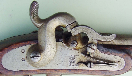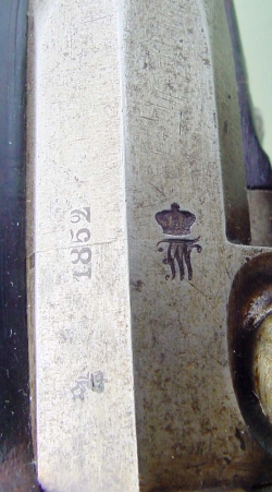 "FW" unter Krone auf der oberen Kantfläche des Laufs ("FW" auf der Patentschwanzschraube, Krone auf dem Lauf) - Monogramm des preußischen Königs Friedrich Wilhelms IV als staatliche Abnahmemarke;