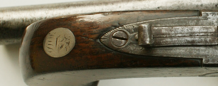 Beschau- und Beschusszeichen „V“ unter Krone und „GP“ unter Krone, jeweils im Oval der Gunnmakers’ Company in der ab 1740 geltenden Form an beiden Läufen rechts.