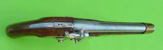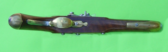 Nussbaumvollschaft mit Messingbeschlägen, diese bestehend aus an der Schaftunterseite in einem Wiederlager verschraubtem Laufring, Abzugsbügel, Kolbenkappe und s-förmigen gewölbten Schlossgegenblech. Am Pulversack seitlich abgeflachter Lauf mit seitlichem Pistonsockel. Abzug mit neuer Stiftsicherung württembergischer Art mit einfach verschraubtem Unterlegblättchen. Perkussionsschloss mit Drehsicherung an der Außenseite der Schlossplatte. |