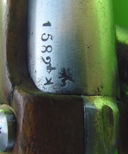 Seriennummer "1582" und "hessischer Löwe " ( Abnahme bzw. Kontrollzeichen ) auf dem Lauf.