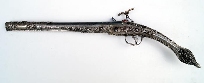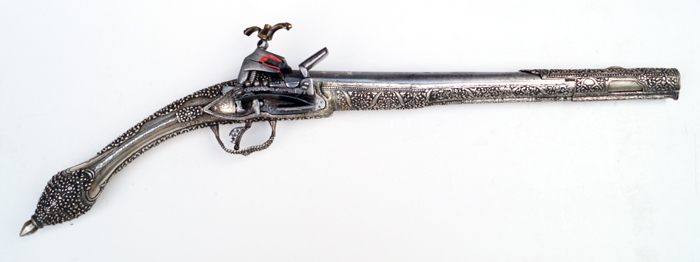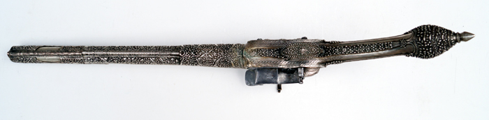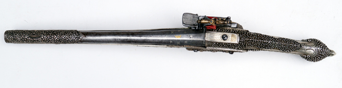 Charakteristischer, gestreckter Schaft mit stark genopptem, massivem Silbeschlag, welcher die gesamte Pistole umfasst. Keine Herstellersignatur. Sehr kleines Miqueletschloss mit Ruhrast und sehr starker, außenliegender Schlagfeder, die Batterieschlagfläche senkrecht gerillt und entfernbar, sie sitzt in einer Schwalbenschwanzpassung. Lauf/Schaft-Verbindung durch Kreuzschraube und eine nur aufgeschobene, silberne und dekorativ getriebene Hülse mit einer Länge von 130mm. Ladestock nur angedeutet. Lauf im hinteren Viertel kantig, zur Mündung hin rund. Auf dem Pulversack im Oval angeordnet acht silbern eingelegte Sterne, in der Mitte ein golden eingelegter Halbmond mit menschlicher Physiognomie. Das Schwanzschraubenblatt mit Silberblech belegt und mit geometrischen Figuren graviert. |