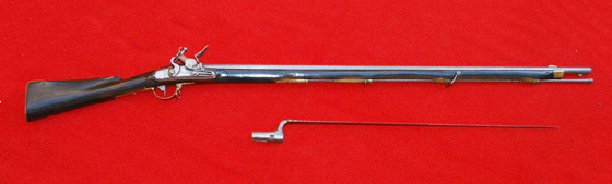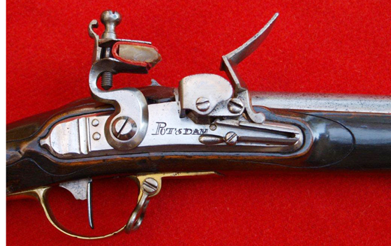 Fertigung Gewehrfabrik Potsdam, hergestellt 1805, runder Lauf, Schlossblech gezeichnet POTSDAM, einfache runde Verschneidung im Schlossbereich, geschwärzter Ahornschaft, zylindrischer Ladestock, 4 trichterförmige Röhrchen, Messingbeschläge, Meisterzeichen im Schloss .O.; auf dem Lauf S mit stilisierter Krone, Herrschermonogramm FWR auf Schlossgegenblech; Langes Bajonett 785 mm Ungewöhnlich, und deshalb erwähnenswert, ist das sehr lange Tüllenbajonett des M/1801. Es sind Längen anhand von Realstücken nachgewiesen von 740 mm bis 797 mm. Das hier gezeigte Realstück hat eine Länge von 778 mm. Im Einsatz stellte sich heraus, dass diese ungewöhnliche Länge bei der Revue sicher imposant aussah, sich aber im Einsatz nicht bewährte. Die starke Hebelwirkung konnte es verbiegen oder gar zu brechen. Auch der Lauf konnte beschädigt werden. Das Bajonett wurde auf eine praktische Länge von ca. 550 mm gekürzt. |