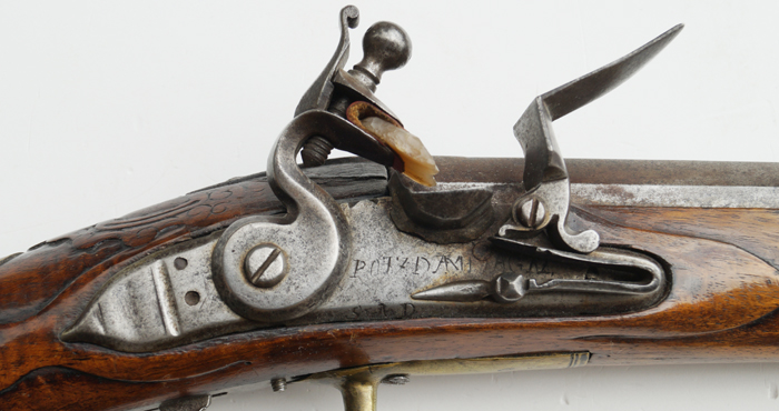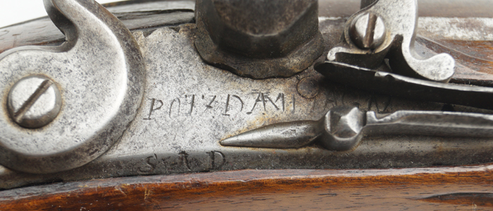 Herstellersignatur „POTZDAMMAGAZ“ am Schlossblech außen, „S et D“ (Splitgerber und Daum) an der unteren Schrägkante des Schlossblechs. Auf der Schlossinnenseite Meisterzeichen „IK“ und stilisierten preußischen Adler als Zeichen der Güteprüfung . Herrscher-Monogramm „F W R“ unter Krone ( = Friedrich Wilhelm I.) auf dem Daumenblech. sonst keine Marken oder Beschriftungen.