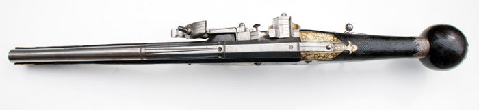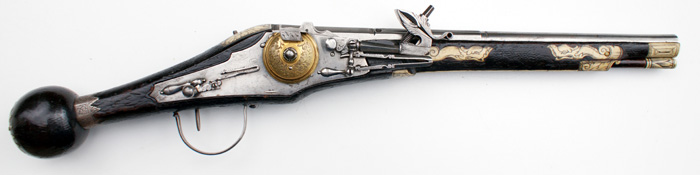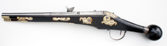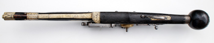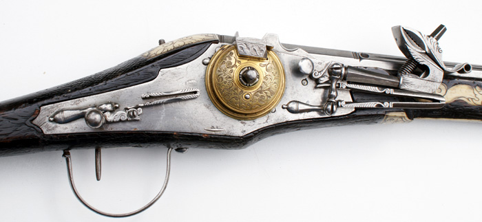 Fast schwarz gebeizter Nussbaum-Noppenschaft mit angesetztem Kugelknauf, um die Löcher der Laufstifte beinerne, ovale Plaketten bündig eingelegt. Vorderschaftkappe, Schiene an der Unterseite des Vorderschafts, Ladestockführung und Umgebung des Schwanzschraubenblattes aus graviertem Bein. An der linken Schaftseite an der hinteren Schlossschraube intarsiertes Dekor in Form einer Schnecke und an der vorderen Schlossschraube ein doppelköpfiges Ungeheuer. Gravierte gezackte Silberbandage am Übergang von Schaft zu Kugelknauf. Am Knaufabschluss ein silbernes, mit 4 Silbernägeln befestigtes Medaillon mit Strahlenkranz, welches das sächsischen Rautenwappen zeigt. Mehrfach unterteilter Lauf, von achtkantig auf rund übergehend mit gestauchter Mündung. Der Mittelbereich des Laufs mit den typischen Dresdener Spitzen. Der hintere, kantige Laufteil mit zwei Perllinien quer zur Laufachse. Am Pulversack Lilienmarke des Dresdener Büchsenmachers Zacharias Herold (erw. 1586-1618). Schloss mit außenliegendem Rad, gewölbtem, vergoldetem und floral graviertem Raddeckel und bündig im Schaft eingelassenem Schloßblech. Pfanne mit federbelastetem Schiebedeckel und seitlichem Drücker. Federbeaufschlagte Wirbelsicherung. Der Hahn mit Sporn unten balusterförmig, oben flach ausgeschmiedet und gewinkelt. Eiserner, breit ausgeschmiedeter Abzugsbügel. Holzladestock mit graviertem Beindopper und Eisenhülse am Ende, diese mit einem Innengewinde zum Aufschrauben eines Krätzers. |
