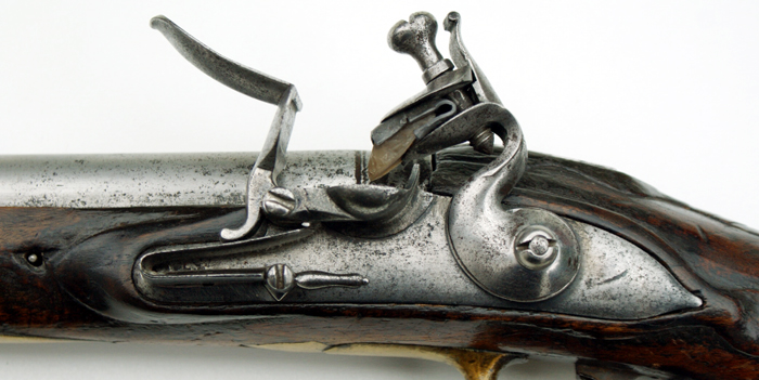 Analog zur Entwicklung der Pistole M 1763 für Offiziere der Kavallerie und Infanterie wurden bei den drei Suhler Lieferanten Witwe Heym & Sohn, Johann Wilhelm Spangenberg und Lorenz Sauer in allererster Linie natürlich Pistolen für die Mannschaften der berittenen Verbände produziert. Auch diese Waffen sind entsprechend dem mit Sachsen geschlossenen Vertrag paarweise geliefert worden und zwar so, dass jeweils eine Pistole das Schloss an der linken und die andere Pistole das Schloss an der rechten Seite hatte. Die hier vorgestellte, völlig original erhaltene, linksseitige Pistole M 1763/67 ist im Gegensatz zu den Pistolen mit rechtem Schloss heute nicht zu selten. Dies hängt damit zusammen, dass mit Einführung des Nachfolgemusters, welches nur noch in der rechten Version gefertigt wurde, die linksschlössigen Pistolen in die Depots wanderten und dort für alle Zeit verblieben, während ihre rechtssgeschäfteten Pendants bei der Truppe verblieben und dort in den langen Kriegsjahren der Rheinbundzeit bis auf minimale Restbestände völlig verschlissen worden sind. Es sind sogar Exemplare bekannt, die in viel späterer Zeit noch auf das Perkussionssystem umgebaut wurden.