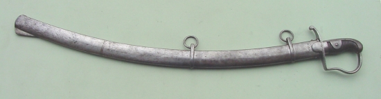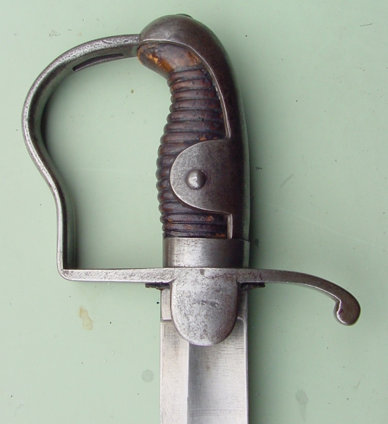 Das Eisengefäß ist von der Parierstange aus rechtwinklig aufgebogen und dannn nach vorne als Griffbügel ausgebaucht, mit Langschlitz für Faustriemen, Kreuzstück mit halbrunden Parierlappen, Griffkappe mit Lappen unten im Griff gehalten, Hülse beledert. Die im Rücken eckige Klinge verjüngt sich bis zum vorderen Drittel um 4 mm, um kurz vor dem im Rücken liegenden Ort wieder die volle Breite von 39 mm aufzubringen. Scheide aus Eisen mit Schlepper und zwei beweglichen Ringen an Bändern.