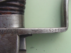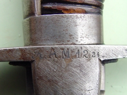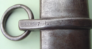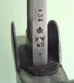Superrevisionsstempel "FW" unter Krone, "65" ( = Jahr der Abnahme), Inspektionsstempel "S" unter Krone und Depotnummer "438" auf dem Klingenrücken.