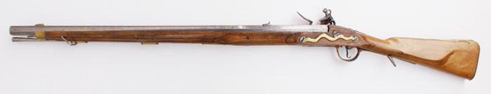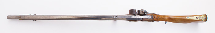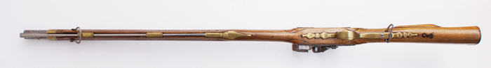 Heller Nussbaum-Vollschaft mit runden Schaftverschneidungen; Kolben mit linksseitiger Backe deutlich abgesenkt. Messingbeschläge, diese bestehend aus halbem Nasenband am Vorderschaft, drei trichterförmigen Ladestockröhrchen, einteiligem Abzugsbügel mit hinterer und vorderer Verlängerung, Kolbenkappe mit ausgeprägtem Fortsatz an der Kolbenoberseite und schlangenförmigem Schlossgegenblech mit drei Schrauben. Konischer, eiserner, Ladestock mit Schraubgewinde am Ende. Anfangs achtkantiger, dann runder Lauf mit 8 Zügen. Standkimme mit einer Klappe, Messing-Ovalkorn auf dem Lauf. Flaches Steinschloss mit abgeschrägten Kanten und ebensolchem Schwanenhalshahn; Eisenpfanne ohne Verbindung zur Batterie. Lauf/Schaftverbindung durch Kreuzschraube und Stifte; Löffelförmige Vorrichtung zum Aufstecken eines Tüllenbajonetts an der Laufunterseite kurz hinter der Mündung. |