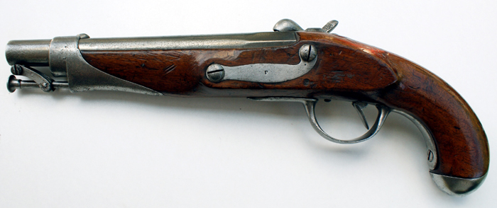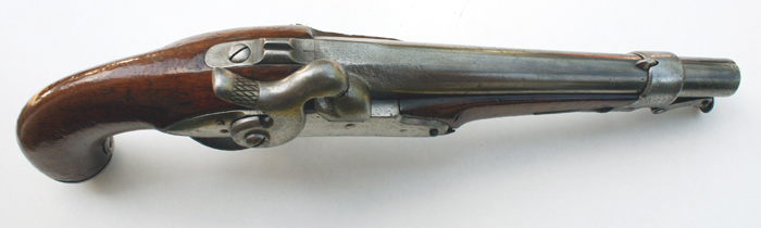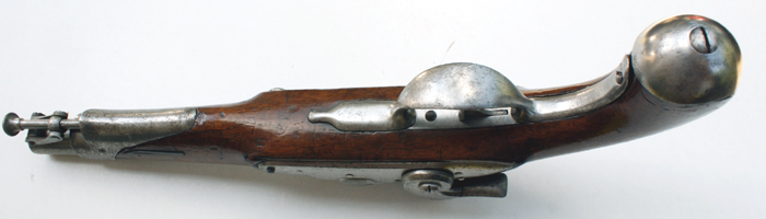 Nussbaumschaft mit Eisenbeschlägen, diese bestehend aus an der rechten Schaftseite federarretiertem Laufring mit an seiner Unterseite angelenktem Ladestock, s-förmigem Schlossgegblech. Perkussionsschloss mit neuem Schlossblech ohne Aptierungsmerkmale. Abzugsbügel mit vorderer und hinterer Verlängerung, Kolbenkappe und flachem, enblech. Runder, am Pulversack kantiger Lauf mit seitlich eingelötetem Pistonsockel. Auf das Schwanzschraubenblatt aufgelötete Standkimme, eisernes Ovalkorn auf dem Lauf, 49mm hinter der Mündung, er greift in eine Aussparung des Laufrings ein. Ladestockscharnier an der Laufunterseite hart angelötet. Fertigung und Umbau auf das Perkussionssystem ab 1843 in der bayerischen Gewehrfabrik Amberg, entsprechende Marke „GF“ im Oval (nur noch andeutungsweise sichtbar) auf dem Pulversack oben. Eiserner Ladestock mit Scharnier, angebracht an der Laufunterseite 3mm hinter der Mündung. |