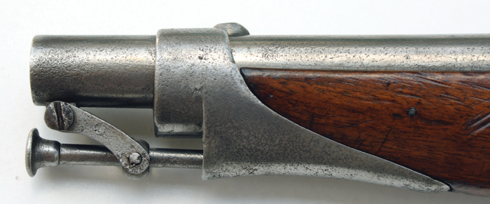 Im Februar 1843 war der Umbau der Scharnierpistole M 1816, die 1843 nahezu 30 Jahre alt waren, auf das Perkussionssystem angeordnet worden. Doch die Direktion der Gewehrfabrik Amberg meldete noch im gleichen Monat erhebliche Probleme bei der fristgerechten Auftragsbewältigung, weil man festgestellt hatte, dass an den doch recht alten Pistolen wesentliche und äußerst notwendige Verbesserungen vorzunehmen waren. So mussten nahezu alle Pistolen neu geschäftet und der doppelbündige Laufring durch einen kürzeren, einbündigen ausgetauscht werden, welcher durch eine Feder an der rechten Seite des Vorderschafts fixiert werden sollte. Grund für diese Änderung war, dass sich beim den bisherigen Pistolen, bei denen das Scharnier am Laufring befestigt war, der „Ladestock nicht selten im Charnier sperrte“, so dass hier konstruktive Abhilfe erforderlich war. Die Neukonstruktion des nun einbündigen Laufrings aber machte eine komplette Neuschäftung der Pistolen unerlässlich.