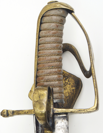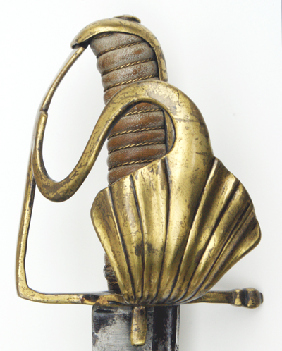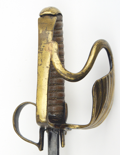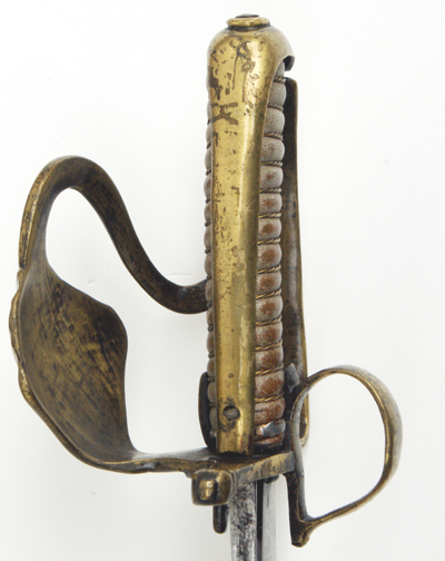 | Griff : | Der rechtwinklig aufgebogene Griffbügel des Messinggefäßes ist hinter der belederten und mit gedrilltem Messingdraht umwickelten Hülse gerade und endet in einem Knopf. Terzseitig verbreitert sich ein Stichblatt muschelartig nach oben, um mit einer s-förmigen Spange in den Griffbügel zu münden. Die Parierstange hat zwei sogenannte nach unten gerichtete halbe Mitteleisen. An dem quartseitigen Mitteleisen ist ein Daumenring angelötet |