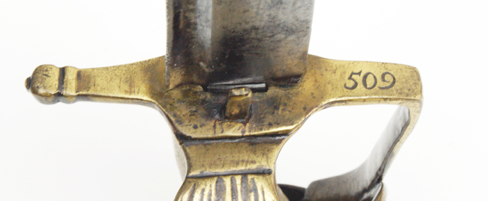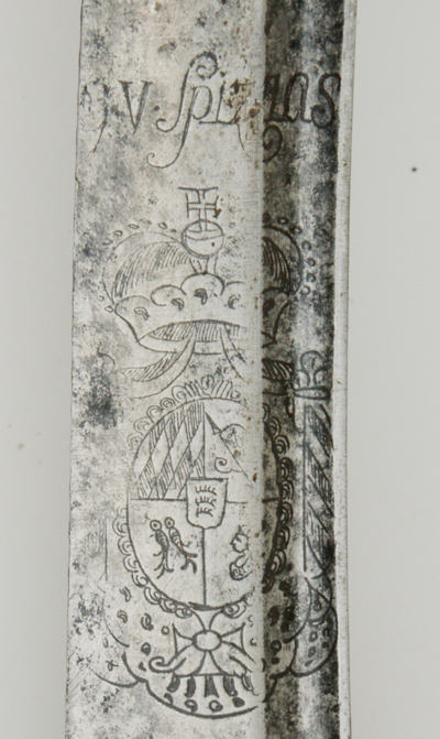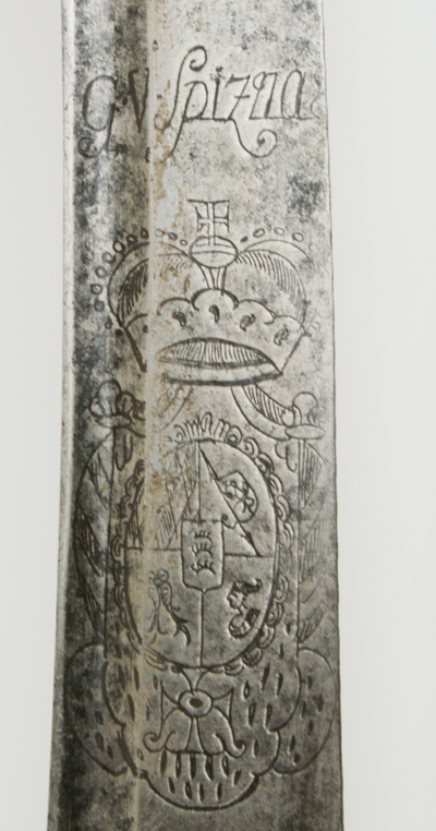 An dem quartseitigen Mitteleisen ist ein Daumenring angelötet. Auf der der leicht gebogenen keilförmigen Klinge mit zwei Zügen ist sind beidseitig das herzogliche Wappen (wie es bis 1789 verwendet wurde) und darüber die Inschrift “G. V. SPIZNAS“ graviert. Die Waffennummer “509“ ist auf der Unterseite der Parierstange eingeschlagen.