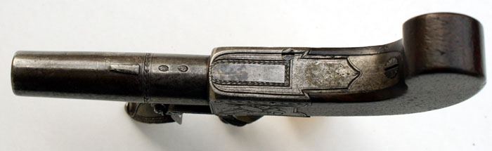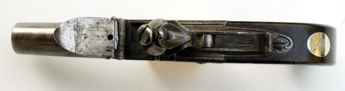 Herstellersignatur „STAUDENMAYER“ links, „LONDON“ rechts auf dem Schlosskasten jeweils in ovaler Kartusche mit nicht verwischten, feinst gravierten Trophäendarstellungen. Batteriefeder mit zwei Friktionsrollen und mit Originalbläuung, auf dem Pfannendeckel verschraubt. Schloss mit Klapp-Abzug. Abschraubbarer Lauf mit Nocken zum Ansetzen eines entsprechenden Schlüssels. Am Schlosskasten oben eine Schiebesicherung mit Dorn zur Verriegelung der Pfanne im geladenen Zustand. Brettschaft aus Nussbaumholz. |
