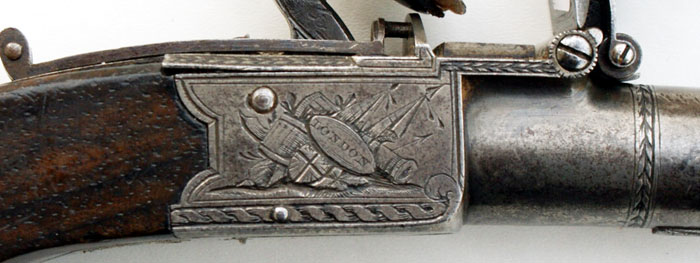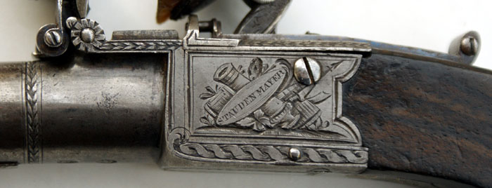Herstellersignatur „"STAUDENMAYER" links, "LONDON" rechts auf dem Schlosskasten jeweils in ovaler Kartusche mit nicht verwischten, feinst gravierten Trophäendarstellungen.