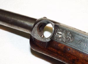 Der Hebel der Walze wird nun in seine horizontale Lage zurückgeschwenkt, wobei die Geschosskammer sich verschließt und die Rundkugel in der Flucht des Laufes zu liegen kommt. Der Hebel des Schlagbolzen schwenkt automatisch bei der Bewegung des Walzenhebels zum Teil unter den Sicherungshaken und der Nocken des Schlagbolzenhebels geht auf Anschlag mit dem Sicherungshaken. |