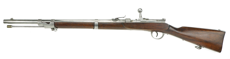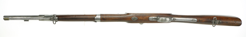 Nussbaumdreiviertelschaft ohne Kolbenbacke, Eisenbeschläge, bestehend aus 2 rechtsseitig federarretierten Laufringen, der erste Ring mit Doppelbund, Abzugsbügel, Kolbenkappe. Vordere Riemenöse am vorderen Laufring, hintere Riemenöse am Schaft hinten. Runder, am Patronenlager kantiger Lauf mit Zündnadelverschluss System Dreyse, aptiert nach Beck. Aufpflanzvorrichtung für ein Seitengewehr an der rechten Laufseite. Putzstock mit Messingkopf und gezacktem Ende. Quadrantenvisier Einteilung von 200-500 Schritt, Korn auf dem Lauf. |