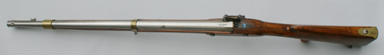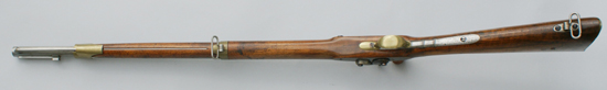 Perkussionsschloss mit Kette, Nuss mit Ruherast, Standkimme auf der Schwanzschraube, Korn auf dem Lauf, 16 mm hinter der Mündung. Kolbenkappe, Laufringe, Abzugsbügel und Unterlegscheiben der Schlossschrauben aus Messing. Unterbügel mit Fingerwülsten aus Eisen; stark gekrümmter Abzug in entsprechender Vorrichtung des Unterbügels eingehängt. Vordere Riemenöse am hinteren Laufring beweglich vernietet, hinterer Riemenöse mit eisernem Sockel an der Kolbenunterseite verschraubt. eiserner Ladestock, Schiene mit Verriegelungsnocken zum Aufpflanzen eines Yatagans an der rechten Laufseite. |
