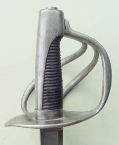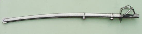 Zwei Spangen mit Endknöpfen verbinden das breite Stichblatt des eisernen Gefäßes mit dem Griffbügel. Der Griff ist aus schwarzem Holz. Leicht gebogene im Rücken eckige Klinge mit beiderseitiger Hohlbahn. Scheide aus Eisen mit Schlepper und zwei beweglichen Ringen an Bändern.